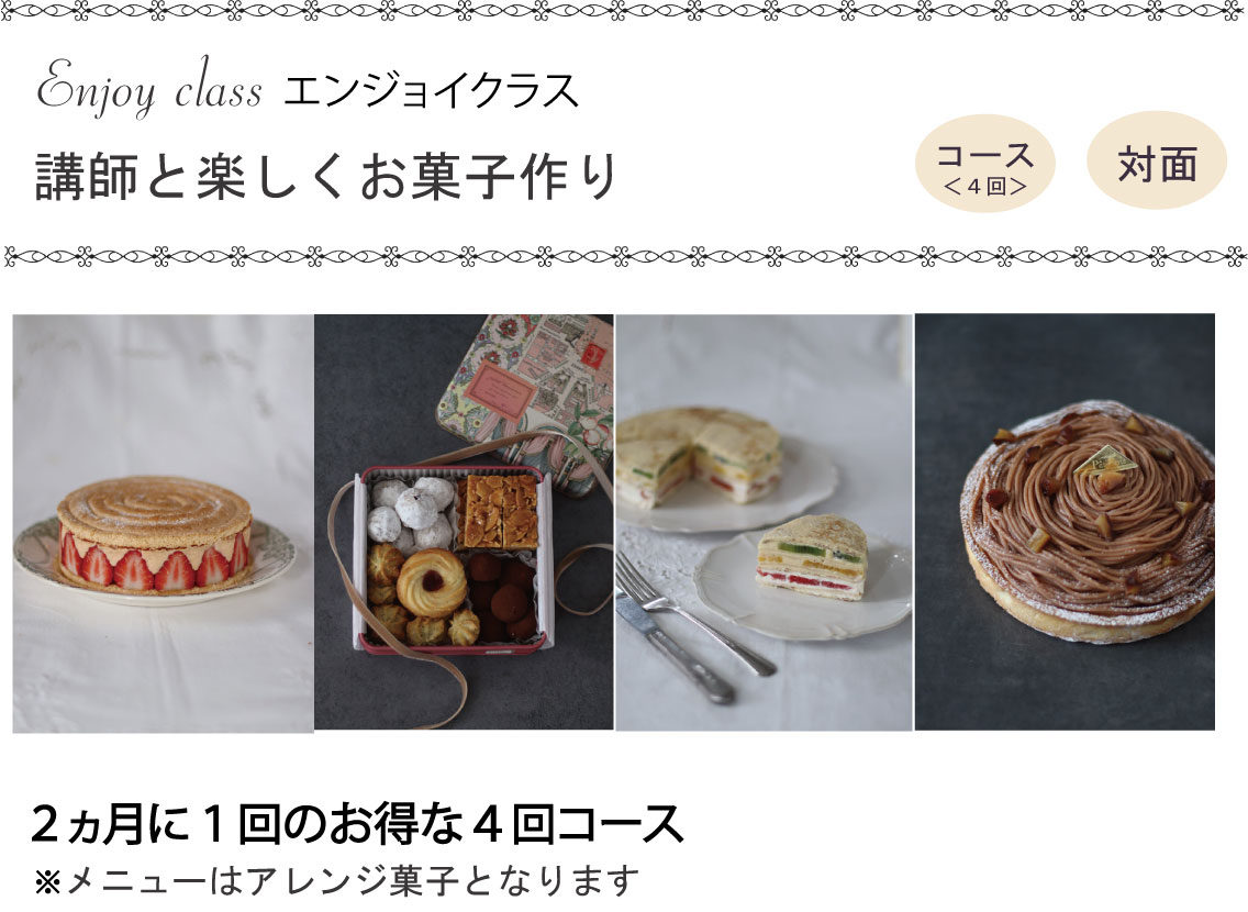 お菓子の基本の工程をもとにアレンジを加えた、可愛くて美味しいお菓子を楽しみながら作ります。少人数制のクラスなので初心者の方でも受講できます。