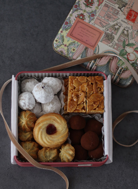 フランス伝統のクッキーを発酵バター、砂糖、卵、塩、とシンプルな材料でいろんな種類のクッキーを作ります。パリの地図をアンティーク風にデザインしたかわいい缶にぎっしり詰めます。