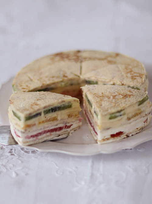 冷やしてももっちりと美味しいクレープを何枚も重ねてフルーツを挟みます。